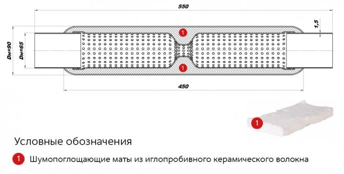 Также между трубой и корпусом проложен наполнитель жаростойкого типа (как правило, базальтовая вата). Этот наполнитель также дополнительно глушит звук. У пламегасителя есть вход и выход, торцы заварены или завальцованы. Как уже говорилось выше, для замены пламегаситель купить необходимо подходящий (в зависимости от мощности ДВС, диаметра, длины и т.д.).