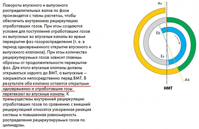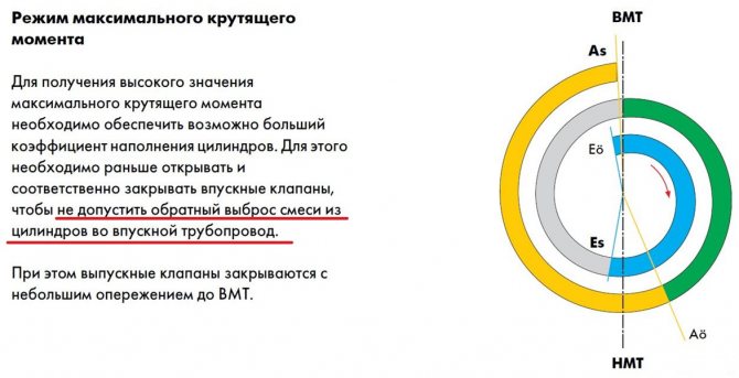 Очень часто на вопрос о загрязнении впускных клапанов и форсунок отвечают стандартными фразами: «некачественное топливо», «несвоевременное обслуживание» или «неправильно подобранное масло». Но, к сожалению, даже при использовании высококачественных материалов и сокращенном интервале обслуживания ситуация радикальным образом не изменится. Чтобы понять причину этой проблемы, давайте рассмотрим диаграмму фаз газораспределения. Один из наиболее характерных режимов, описывающий важность регулирования фаз газораспределения, на стандартной круговой диаграмме выглядит так:
