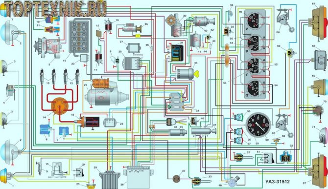 Из вышеперечисленного следует, что оборудование УАЗ 31512 состоит из нескольких электрических цепей. Проводка выполнена разноцветными проводами. Это облегчает процедуру ремонта при наличии цветной схемы.