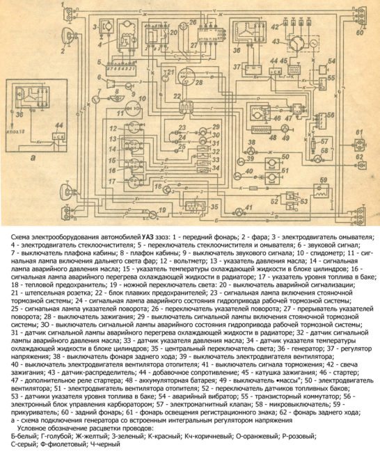 Завод сразу предупреждает о возможности внесения изменений в электросхему. Поскольку машине почти 30 лет на ходу, такие изменения есть. Приведу несколько схем с контактной и бесконтактной системой обеспечения зажигания для разных уазиков. Но так как в те времена особых различий не было я считаю их аналогичными с некоторыми отличиями.