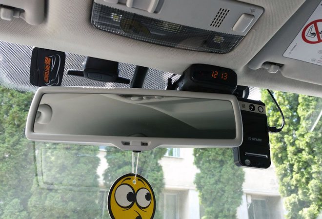 - В легковом автомобиле он закрепляется за зеркалом заднего вида на лобовом стекле. В грузовых машинах – на том же лобовом стекле внутри автомобиля, но внизу, сразу над дворниками.