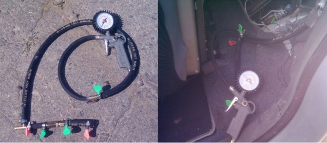 Но, есть и более доступный вариант, где мы будем применять подручные средства. Речь идёт о стандартном манометре, который позволяет замерять давление в шинах. Он имеется в наличии почти у каждого автовладельца. Но, тут нужно помнить, что воздушные манометры рассчитаны на замеры давления с большими значениями, около шестнадцати атмосфер, тогда как модели для топлива ограничены шестью атмосферами.