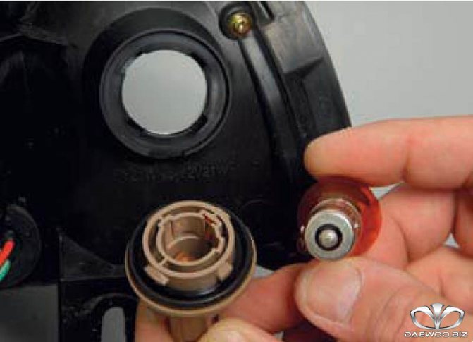 Поворачиваем патрон лампы указателя поворота против часовой стрелки и извлекаем патрон с лампой из корпуса блок-фары.
