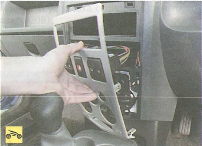 Работу проводим при замене выключателей или накладки консоли панели приборов. Снимаем переднюю панель головного устройства системы звуковоспроизведения. Затем, чтобы вынуть головное устройство из гнезда центральной консоли панели приборов…