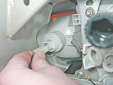 5. Теперь извлекается неисправная лампа и проводится ее замена на новый элемент. Новую лампу устанавливают в патрон, а патрон, в свою очередь, в корпус фары. После этого электрический разъем подсоединяется к аккумулятору.