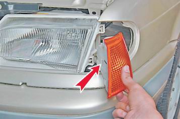 Работа показана на левом указателе поворота. Снятие правого указателя поворота выполняется аналогично. Для удобства работы елевым указателем поворота, можно снять аккумуляторную батарею, а для работы с правым указателем поворота – бачок омывателя ветрового стекла.