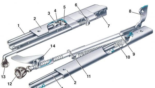 Если сиденье не двигается взад-вперёд, то причина — поломка салазок. Состоят они из таких элементов: