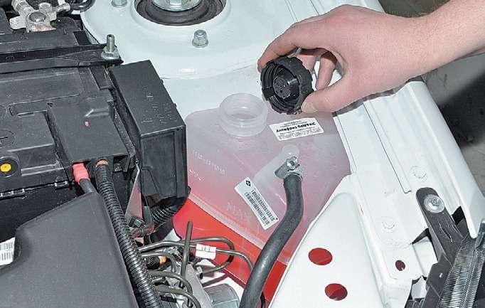 Если двигатель горячий, необходимо дать ему остыть, а затем сбросить избыточное давление в системе охлаждения, отвернув крышку расширительного бачка.