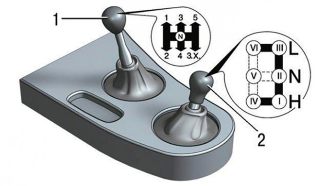 Раздаточную коробку (на рисунке её рычаг – 2), можно переключать аналогично КПП, только назначение переключений рычага – совсем другое. Есть нейтральное положение (NII–V). Есть повышенная передача (HI), используемая для нормальных дорожных условий, с разблокированным дифференциалом. Если требуется его заблокировать, включается передача (HIV). В труднопроходимых участках рычаг переключается на LIII, если дифференциал ещё не нужно блокировать. Если совсем тяжело проехать, нужно переключиться на LIV, заблокировав между собой мосты. Колёса вращаются тогда с одинаковой скоростью.