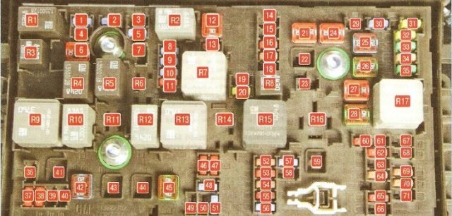 Так выглядит схема блока в котором находятся предохранители Шевроле Круз: