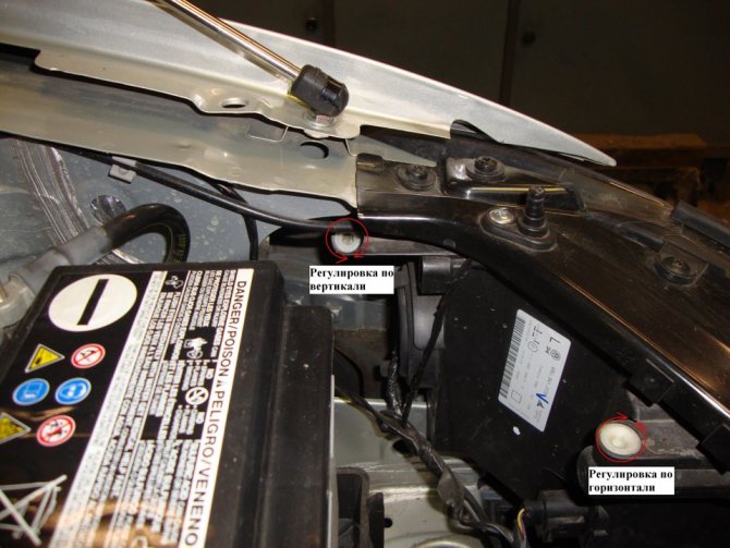 Теперь можно приступать к регулировке фар. Откройте крышку капота и найдите моторный щит передка, на котором и располагаются элементы корректировки. Так, на задней стороне каждой из фар располагается по два регулятора. Их размещение, по отношению один к другому, зеркальное.