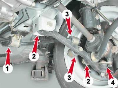 5. Визуально проверяем состояние подушек (1) и стоек (3) стабилизатора поперечной устойчивости, резинометаллических шарниров рычагов и продольных растяжек (2), чехлов шаровых опор (4).