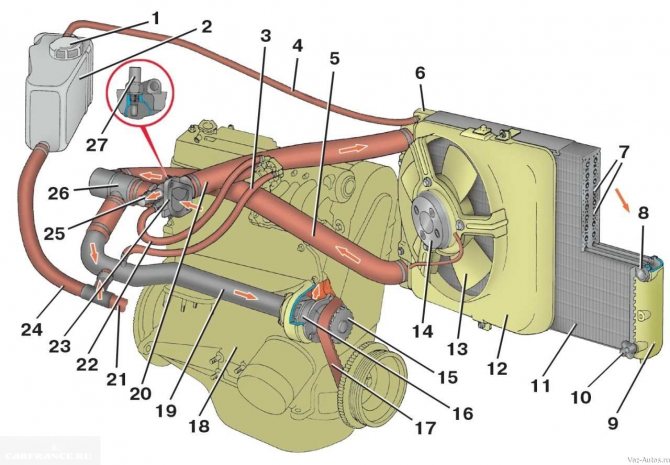 1 – элемент в виде пробки для бака расширения; 2 – бак для расширения; 3 – шланг отвода жидкости из патрубка; 4 – шланг проходящий между радиатором и бачком расширительным; 5 – шланг отводящий от радиатора; 6 – бачок с лева от радиатора; 7 – трубка алюминиевая; 8 – системы заглушки; 9 – бачок с права от радиатора; 10 – пробка для слива; 11 – середина радиатора; 12 – кожух для электрического вентилятора; 13 – пластиковые крылья электрического вентилятора; 14 – электрический двигатель; 15 – насосный шкив зубчатый; 16 – крыльчатка насоса; 17 – ремень привода вала распределительного; 18 – блок для двигателя; 19 – насосная труба; 20 – шланг для радиатора с подводящей функцией; 21 – шланг радиатора отопителя с функцией отвода; 22 – шланг подводящий охлаждающую жидкость к дроссельному патрубку; 23 – выпускной патрубок; 24 – шланг для заправки; 25 – шланг радиатора отопителя с функцией подвода; 26 – термостат; 27 – датчик температуры охлаждающей жидкости; 28 – датчик указателя уровня охлаждающей жидкости.
