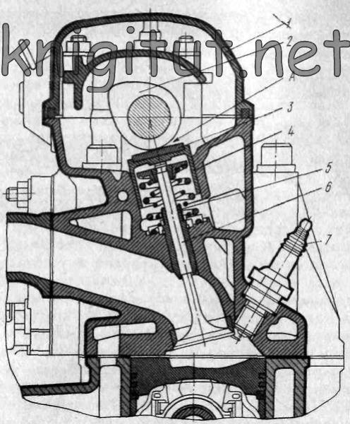 1 — крышка головки цилиндров, 2 — кулачок распределительного вала, 3 —регулировочная шайба, 4 — толкатель, 5 — маслоотражательный колпачок клапана, 6 — клапан, 7 — свеча зажигания; А — регулировочный зазор