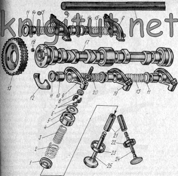 Рис. 11. Механизм газораспределения двигателя «Москвич-412»: 1— опорная шайба, 2 — наружная клапанная пружина, 3 — внутренняя клапанная пружина, 4— колпак, 5 — тарелка, 6 — уплотнительное кольцо, 7 — сухари, 8 — наконечник регулировочного винта, 9—коромысло, 10 — большая распорная втулка, 11 — шайба, 12 — упорный фланец, 13 — ведомая звездочка, 14— малая распорная втулка, 15— пружина коромысла, 16—ось коромысел выпускных клапанов, 17 — распределительный вал, 18— установочный штифт, 19 — контргайка, 20— регулировочный винт, 21 — направляющая втулка клапана, 22 и 23 — гнезда выпускного и впускного клапанов, 24 и 25 — выпускной и впускной клапаны