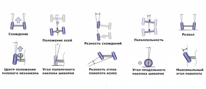 Данный параметр указывает на углы установки колес, по отношению друг к другу, а также к колес к плоскости дорожного полотна.