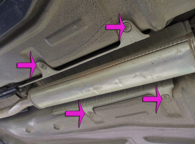 Перед началом работ подготовьте место, в котором вы будете их выполнять. Лучший вариант — гараж с ямой или подъёмником. Если его нет, можно использовать домкрат и поднять заднюю часть машины. Элементы, необходимые для регулировки стояночного тормоза, располагаются под защитным кожухом. Он расположен между натяжителем и трубой глушителя. Защиту нужно будет снять.