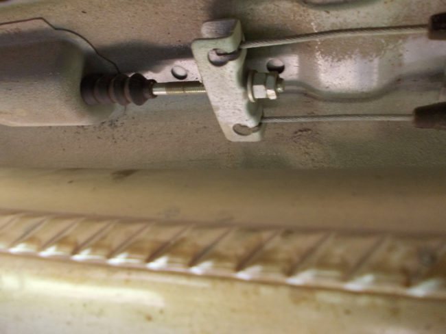 - Для подтягивания троса используется ключ на 13. Найдите гайку, расположенную недалеко от пластины, и закрутите её. Также надо отыскать крайнюю гайку и затянуть её, а первую зафиксировать. Нужно ослабить этот элемент системы? Действия те же, только в обратном порядке. Приготовьтесь к трудностям — придётся часто менять положение ключа из-за неудобного расположения элементов.