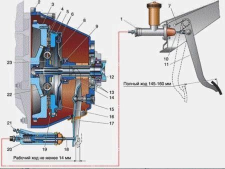 Чтоб сделать требуемое усилие при нажатии, предусмотрена пружина с лепестками, которые подвергаются воздействию выжимного подшипника. Он представляет собой связывающее звено меж приводом и сцеплением, на которое крепится вилка с рычагом. На его конце закрепляется другой рычаг или трос, ведущий к педали сцепления.