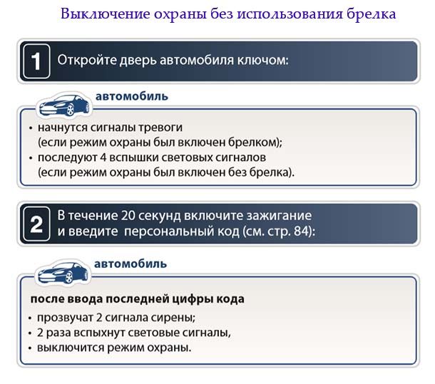 В случае если пульт утерян, предусмотрено аварийное отключение сигнализации. Владелец авто должен открыть дверь авто при помощи ключа. Далее, не более чем через 20-ть секунд, включить зажигание и нажать сервисную кнопку три раза – так автомобиль перейдет в особый режим. Снова выключить зажигание – если все прошло успешно, то автомобиль два раза издаст звуковой сигнал.