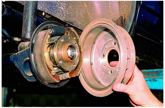- Начинайте работу с демонтажа колеса. После снимайте барабан, выкручивайте опорные «пальцы». Далее демонтируйте старые трубки и колодки.