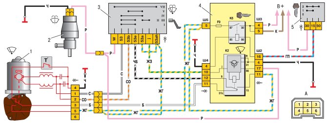 1 – электродвигатель омывателя ветрового стекла; 2 – электродвигатель очистителя ветрового стекла; 3 – монтажный блок; 4 – выключатель зажигания; 5 – реле разгрузки выключателя зажигания; 6 – переключатель очистителя и омывателя ветрового стекла; К3 – Реле стеклоочистителя; А — к источникам питания; В — порядок условной нумерации штекеров в колодке электродвигателя очистителя