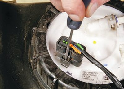 15. Подденьте фиксаторы клемм проводов датчика уровня топлива и извлеките их из колодки.