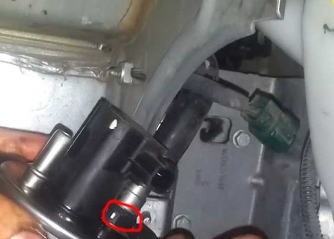 Изначально нужно снять правое переднее колесо и расположенную ближе к передней области авто Меган часть подкрылка. Приподнимаем фильтр вверх и изымаем его с кронштейна. После, отключаем питание, путем поднятия защелки и оттягивания кабеля назад, как указано на фото.