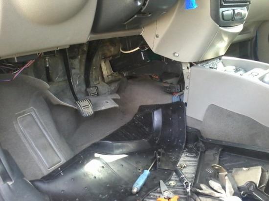 Переместившись внутрь салона, надо снять трос привода акселератора и открутить саму педаль, что держится на 3 болтах. Дальше снимается декоративная защита радиатора, представляющая собой пластиковую панель справа от педали газа.